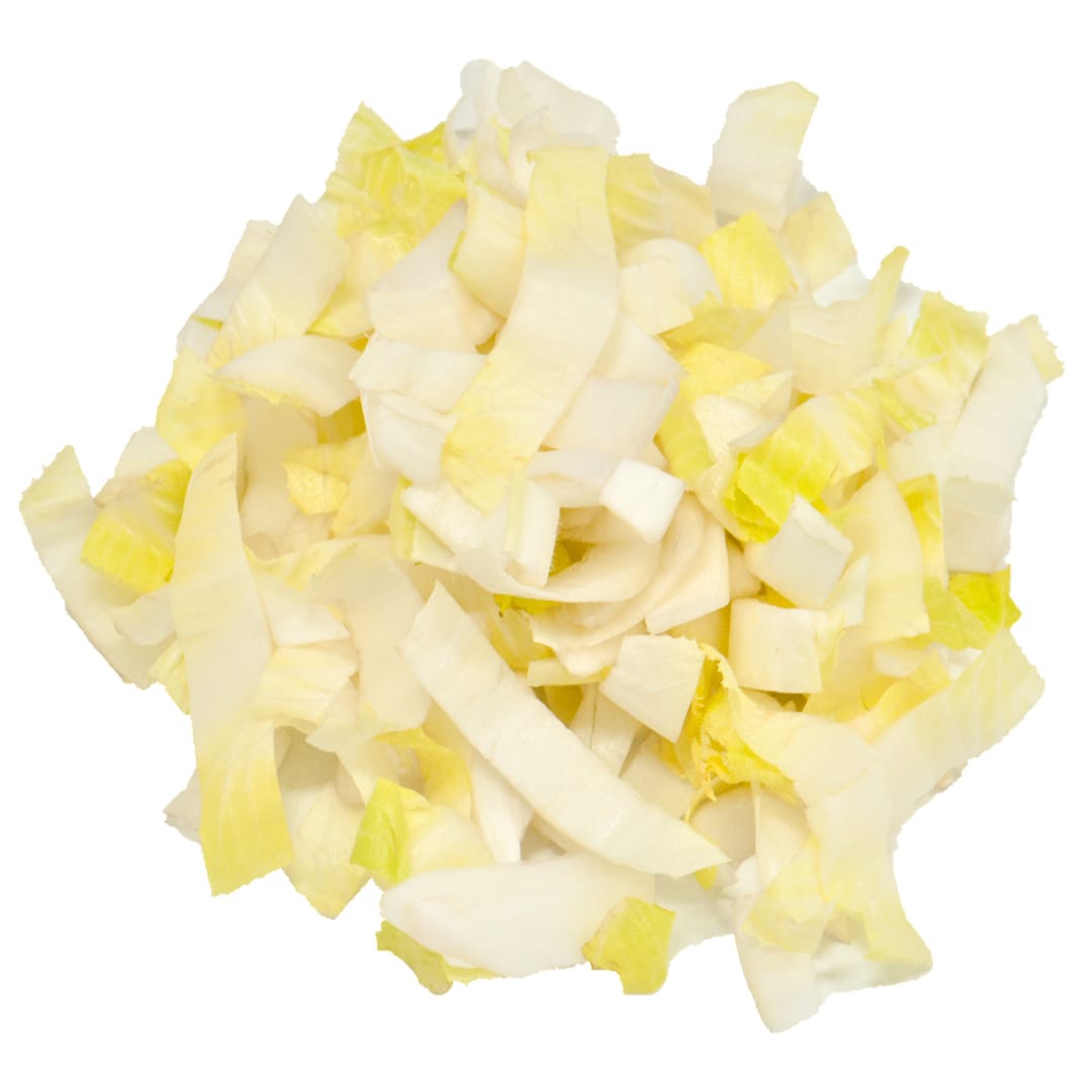 Cut vegetables are elevated and fed into the primary vortex washing machine.